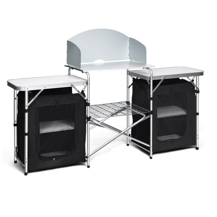 1.Cooking On the Go: Comes with large cooking table with windscreen, this portable kitchen cook station is the outdoor camping essential to ensure more effective burning and enable you to enjoy a big meal anytime. Perfect for picnics, backyard barbecues, tailgating parties, or an overnight hit outdoors.