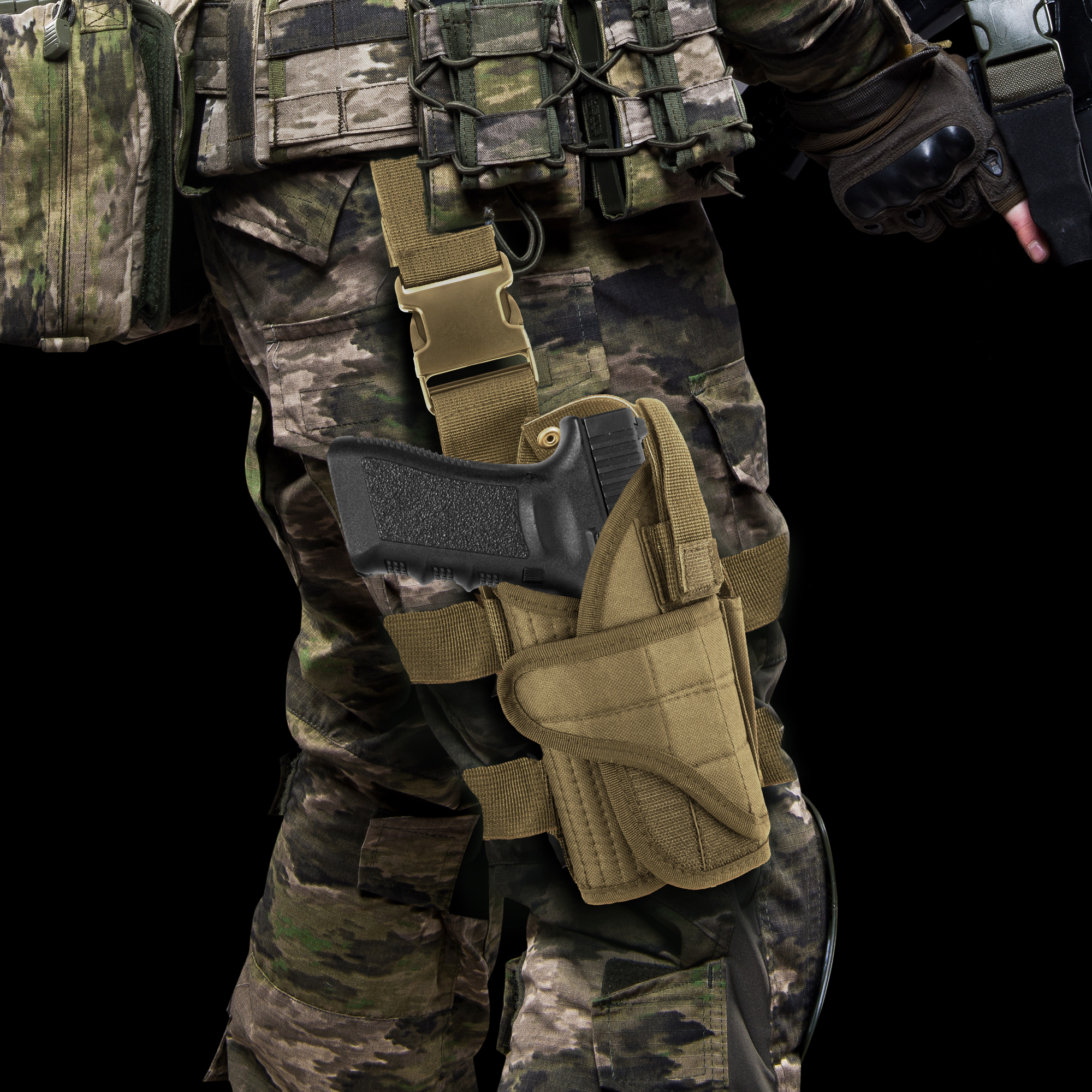 Designed to withstand the toughest outdoor conditions, the military thigh holster is made of high quality 500D nylon.  It is waterproof, scratch-resistant, wear-resistant and completely adjustable. The thigh holster also allows you to easily adjust the retention strap, the magazine retention strap, the ride on the holster, and the muzzle height to meet your requirements.