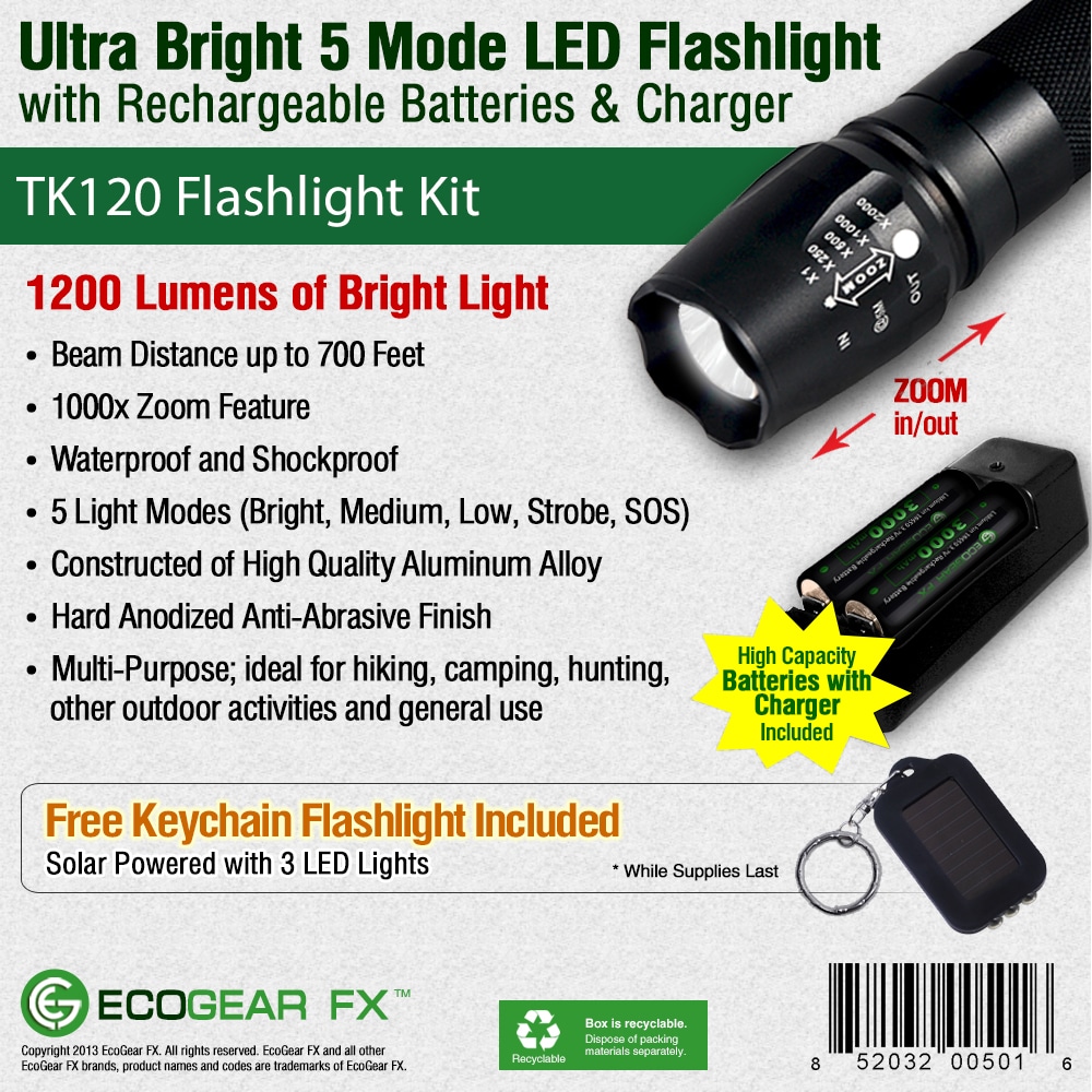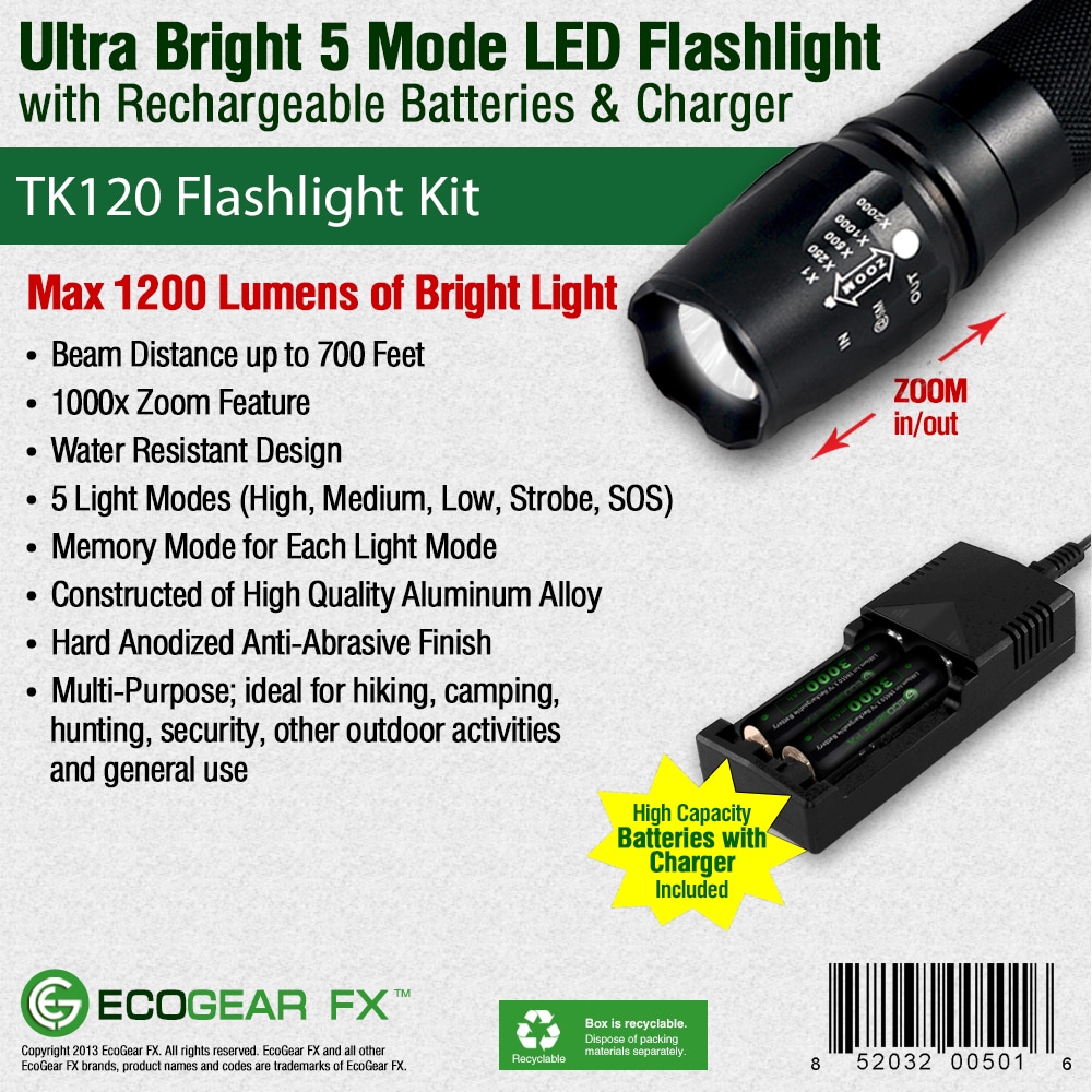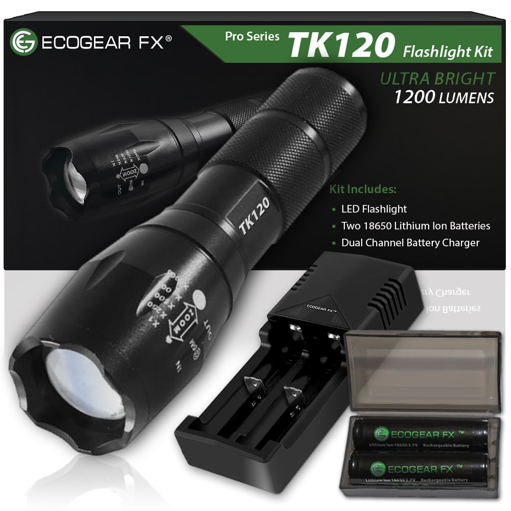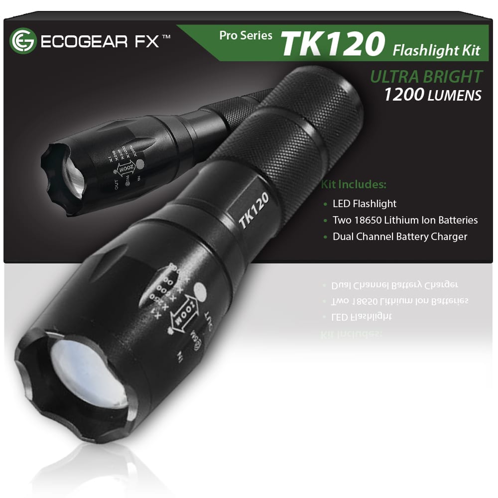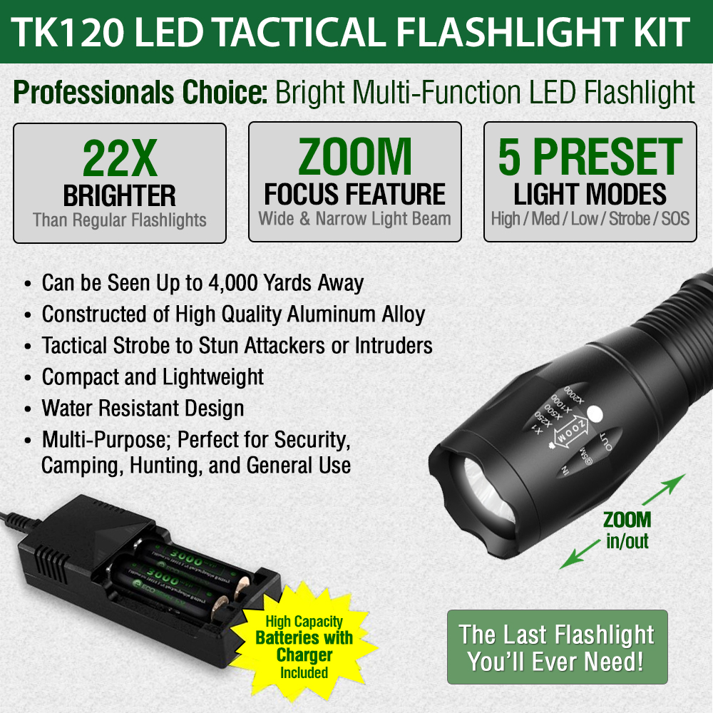 LED Tactical Flashlight KitThe TK120 LED Flashlight is a complete professional LED flashlight kit for home use, outdoor activities, security and professionals. Equipped with multiple light modes, the TK120 LED Tactical Flashlight delivers excellent light spread when using the zoom feature (adjustable focus). Constructed using high-quality standards, the TK120 Professional LED Flashlight is made of aircraft grade aluminum alloy with a hardened anodized finish. So when the going gets tough the TK120 Flashlight gives you high-strength and durability needed for nearly any situation. As an extremely rugged tactical flashlight, the TK120LED Flashlight Kit includes two high capacity lithium-ion rechargeable batteries and a rapid battery charger. Ideal for many situations and uses, the TK120 makes a perfect LED tactical flashlight with strobe. Not only is it great for professionals but makes a great flashlight kit for tactical situations, family camping, hunting trips, fishing and night patrols. It is a very useful LED emergency flashlight to aid in emergency assistance and natural disasters including earthquakes, hurricanes and storms.